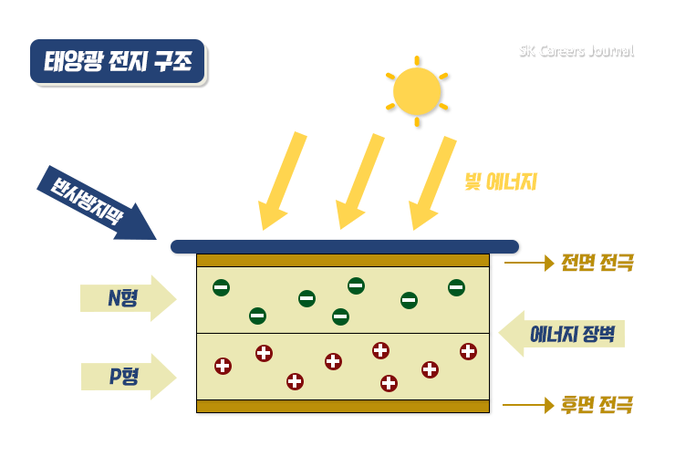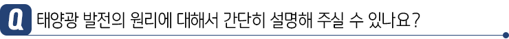 태양광 발전은 빛에너지가 전기에너지로 변환되는 광전효과에 의해 전기를 만들어냅니다. 일반적으로 태양광 발전에서 사용하는 실리콘 태양전지를 기준으로 간단하게 설명해 드리겠습니다.