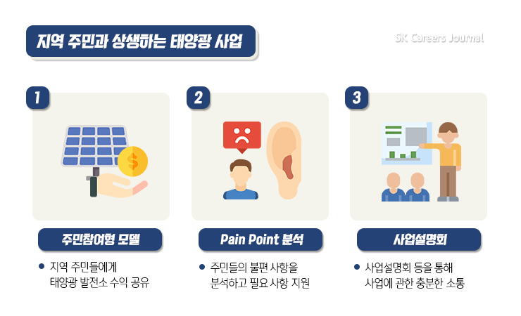 사실 사업부지 확보, 인허가, 계통 검토, EPC, 파이낸싱, 지역 수용성 확보 등 어려운 게 너무 많은데요(웃음). 다른 것은 모두 기술 및 경제적인 이슈라면, ‘지역 수용성’은 실제 지역 주민들의 생활과 연결되는 이슈이다 보니, 저희가 가장 신경 쓰고 있는 부분입니다.