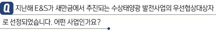 SK E&S는 “일자리를 창출할 창업클러스터를 구축, 장기적으로 새만금에서 생산된 전기를 활용하는 데이터센터를 설립해 국내외 IT기업을 유치”하는 내용으로 공모에 참여했죠. 최종적으로 우선협상대상자로 선정되어 이에 대한 인센티브인 수상태양광 200MW 사업권을 확보하게 되었습니다. 민간 기업으로는 최대 규모라는 점이 정말 자랑스럽습니다.