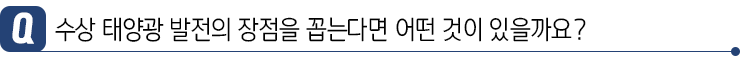우선 국토가 좁은 우리나라에서 넓은 면적으로 태양광 발전소를 건설할 수 있다는 점이 가장 큰 장점일 것 같습니다. 또한, 태양광 패널의 효율이 온도에 의해 영향을 많이 받는데요. 25℃가 넘어가는 순간부터 1℃당 약 0.5%의 효율이 떨어집니다. 따라서 수면 위에 있어 육지보다 온도가 낮다는 것도 장점이 될 수 있습니다.