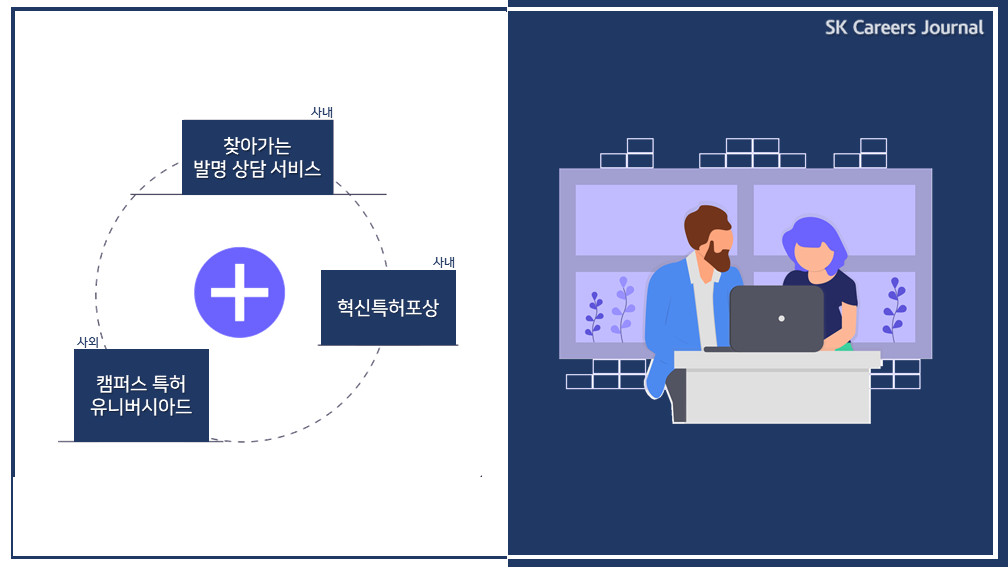 SK하이닉스는 자체적으로 특허관리시스템을 구축하며 경쟁력을 확보하고 있습니다. 구체적으로는 사내 연구원/엔지니어의 아이디어 발굴을 돕기 위해 ‘찾아가는 발명상담 서비스’를 운영하고 있으며, 사내 구성원의 특허 개발을 장려하기 위해 ‘혁신특허포상’ 제도 또한 운영하고 있습니다. 한편, 사외적으로는 2008년부터 약 13년간 특허청이 주최하는 ‘캠퍼스 특허 유니버시아드’ 행사에 참여하여, 대학/대학원생들을 대상으로 특허 문제를 출제하고 시상하는 업무를 수행하고 있기도 합니다. 이처럼 SK하이닉스는 특허분쟁 및 특허개발에 대해 많은 노하우를 가지고 있는 기업입니다. 특허에 관심이 있으신 분들이라면, SK하이닉스와 함께 역량을 펼쳐 보셨으면 합니다.