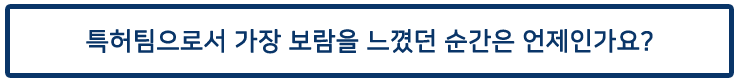 특허 직무에 대한 팀원 분들의 자부심이 피부로 와닿는 인터뷰였습니다. 특허라고 하면 모두가 그 필요성을 실감하지만, 막상 특허가 왜 중요한지에 대해서는 생각해보는 경우가 적은 것 같습니다. 이번 기회를 통해 특허의 중요성을 다시 깨닫고, 특허 직무에도 많은 관심을 가져주셨으면 합니다!
