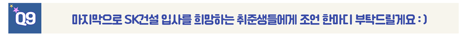 취업 준비에 많이 지칠 수도 있겠지만, 여러분 스스로가 ‘나는 훌륭한 사람이다.’라는 마음가짐으로 이곳저곳 부딪칠 수 있는 용기를 꼭 가지시길 바랍니다. 아마 입사하게 되신다면 가장 먼저 저를 만나게 될 수도 있겠네요. (ㅎㅎ) 그날을 기다릴게요. 꼭 SK건설에 입사해서 함께 밝은 미래를 그려보아요. 모두들 파이팅입니다!