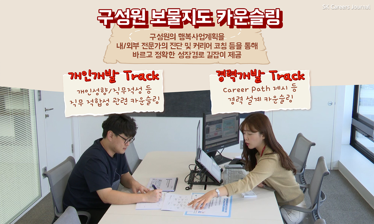 2가지 Track으로 운영이 되고 있는데요. 첫 번째 개인 개발 Track의 경우에는, 개인 성향/직무 적성 등 직무적합성 관련 카운슬링을 제공하고 있고요. 두 번째 경력 개발 Track의 경우에는 Career Path 제시 등 경력 설계 카운슬링을 제공하고 있습니다. 이 카운슬링은 성장을 희망하는 구성원 누구나 참여가 가능하고, 상시 모집으로 운영하고 있습니다.