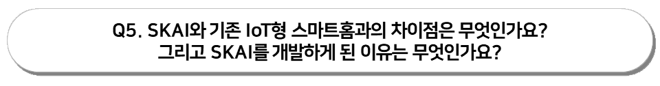 기존 대부분의 건설사들이 적용하고 있는 IoT형 스마트 홈은 편리한 기술이지만 제대로 사용하기 위해서는 사용자가 스마트폰 또는 세대 내 월패드에서 일일이 조작해야 하며, 기기 사용이 익숙하지 않은 연령층에는 현실적으로 사용이 제한되기도 하는 불편함이 존재하였습니다. 반면 SKAI는 사용자 개인의 Life Style을 학습할 수 있는 인공지능 기술을 채택하여 사용자가 스마트폰 및 월패드를 사용하지 않아도 상황별 안내와 Device 제어를 제공받을 수 있는 새로운 기술입니다. 따라서 SK VIEW 입주고객은 인공지능이 적용되는 미래형 생활 환경을 경험할 수 있습니다.