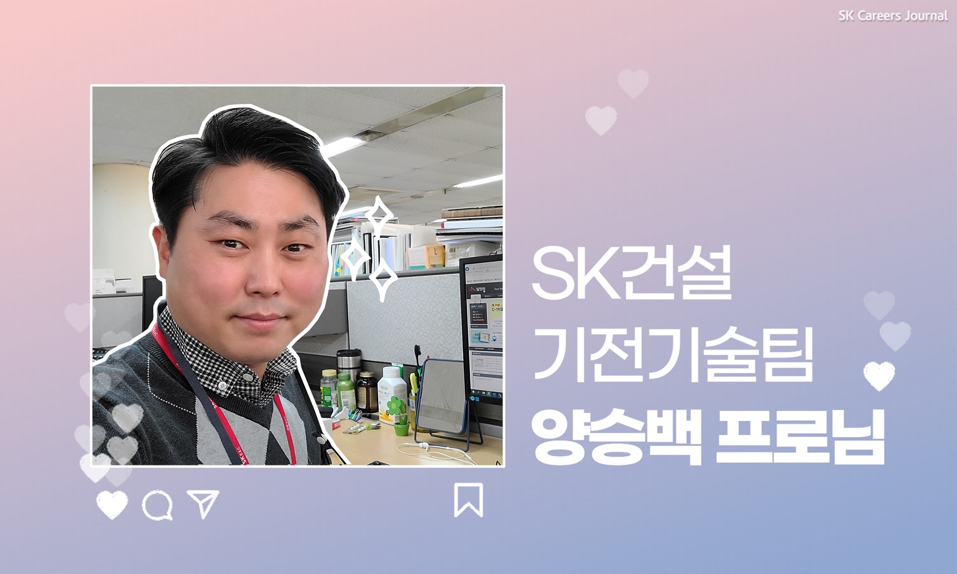 안녕하세요. SK건설 기전기술팀 양승백 프로입니다. 저는 에코 스페이스 부문 기전 분야의 신기술 및 신공법 개발과 PJT 관리 업무를 담당하고 있습니다.