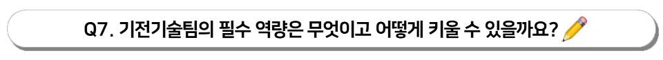 따라서 기전기술팀에서 필요로 하는 역량은 폭넓은 관점에서 볼 수 있는 관찰력과 기술 개발을 위한 필수 요소인 창의적인 사고력을 갖추는 것, 그리고 자기 완결형 일처리입니다. 사실 올 라운더 플레이어면 가장 좋겠지요~^^ PJT 전반에 걸친 관리가 필요하기 때문에, 일처리를 함에 있어 그때그때 끝내는 게 아니라 전체적인 관점에서 마일스톤을 항상 정리하여 계획 대비 실적 리뷰를 지속적으로 해야 합니다. 그리고 벌어진 일들을 다 주워 담아서 완결을 할 수 있어야 합니다. 그러기 위해선 자기주도적인 책임감이 필요하겠지요. 창의적인 사고력은 단기간에 기르기는 어렵습니다. 똑같은 사물을 보더라도 사람마다 다 다르게 평가를 합니다. 사람마다 관심분야가 다르기 때문입니다. 창의적 사고력을 기르기 위해서 제가 가장 중요하게 생각하는 건 ‘관심’이 있어야 한다는 겁니다. ‘관심’을 가지면, 전시회도 찾아가보고 전문서적과 논문을 찾아보고, 강의를 찾아 듣게 되면서 다양한 경험을 쌓게 되겠죠. 이러한 경험들이 결국 창의적인 사고력을 키울 수 있다고 생각합니다.
