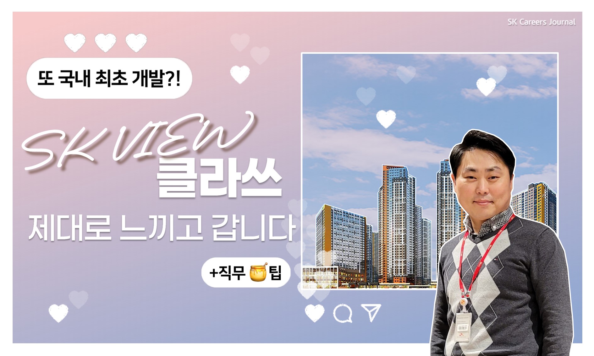 지금까지 SK건설에서 SK VIEW 상품개발을 책임지는 양승백 프로님의 이야기를 들어봤습니다. 어떠셨나요? 업무에 대한 뜨거운 열정과 고객을 생각하는 마음을 고스란히 담은 인터뷰가 아니었나 싶은데요. 기전기술팀의 필수 역량 4가지로 관찰력, 창의적 사고력, 자기 완결형 일처리, 그리고 자신의 관심분야와 세상에 대한 끊임없는 관심이 중요하다는 프로님의 말씀을 꼭 명심하시길 바랍니다!
