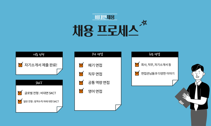 먼저 서류 – SKCT – 1차 면접 – 최종 면접으로 진행이 됐어요. 제가 지원한 ‘일반 전형’은 SKCT를 제외하고 모두 비대면으로 진행이 되었구요, 다른 전형인 ‘글로벌 전형’은 모든 프로세스가 다 비대면으로 진행되었어요. 일반전형 같은 경우에는 SKCT는 지원자들이 함께 모여서 대면으로 응시를 하였어요. 이후에 두번의 면접은 모두 비대면으로 진행이 되었구요. 1차 면접은 패기 면접, 직무 면접, 공통 역량 면접, 영어 면접, 이렇게 총 네 가지 면접으로 진행이 되었어요. 최종 면접 같은 경우에는 면접관님들과 회사, 직무, 자기소개서 등 다양한 주제로 대화를 나누었습니다.