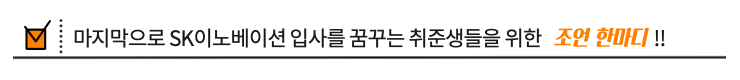 지난 17일, 4주 간의 SKI계열 신입사원 연수 과정을 끝마친 SK이노베이션 신입사원들! (짝짝짝) 이번 상반기는 채용부터 교육 연수까지 모두 비대면으로 진행되었다는 사실! 알고 계셨나요? 대면 채용이 더 익숙한 취린이들을 위해 비대면 채용의 모든~ 것을 준비해봤습니다. 그리고 요즘 핫하디 핫한 배터리 관련 직무에 관해서도 준비해보았어요. 자, 그럼! 과연 어떤 비결로 높은 경쟁률을 뚫고 이노人이 되었는지! 갓 입사한 SK이노베이션 신입사원의 따끈따끈한 후기와 꿀TIP 들어보러 가볼까요? GO GO~