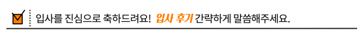 다른 분들도 그러듯이 취업준비를 하게 되면 마음고생이 정말 심하잖아요. 입사를 하게 되니 취업준비 과정에서 겪었던 마음고생을 몇 배로 보상받은 기분이더라구요. 일을 배우는 보람도 느끼고 있을 뿐만 아니라 선배님들, 그리고 동기들과 어울리는 즐거움도 매일 느끼고 있어요. 그리고 신입사원 soft-landing을 위한 다양한 프로그램을 회사에서 준비해주고 있고, 많은 선배님들이 부서를 가리지 않고 교육과 생활 면에서 도와주시고 계셔서 아주 든든합니다! 자랑 하나만 덧붙이자면요, 저희 회사 식사가 진짜~ 맛있어요. 특히 점심 식사가 알차게 나와서 정말 맛있답니다. 식사하고 나면 선배님들이 커피도 자주 사주셔서 항상 배부름 상태예요. 하하.