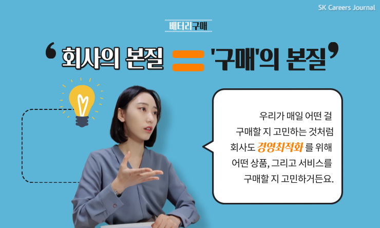지금 저는 SK이노베이션 소속으로 근무하고 있어요. SK이노베이션의 배터리사업부의 경영지원 직렬 중 구매 직무로 입사하게 되었습니다!