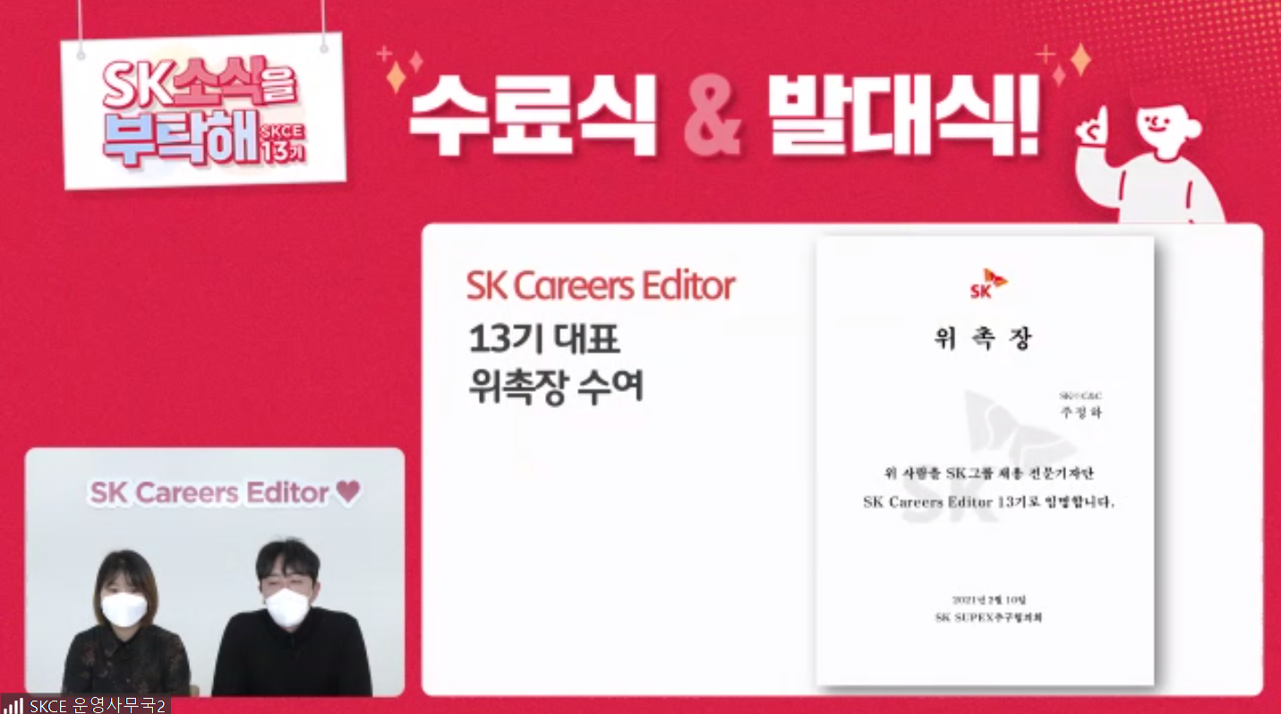 어느덧 시간이 흘러 지난 1월까지의 SKCE 12기의 활동이 마무리되었습니다. 끝은 또 다른 시작이라고 하죠. 12기 활동 마무리와 동시에 새롭게 SK Careers Journal을 이끌어갈 13기의 활동도 시작되었습니다. 지난 2021년 2월 10일, 12기 수료식과 13기 발대식이 진행되었는데요. 상황이 상황인만큼 언택트 수료&발대식으로 진행되었습니다. 비록 직접 만나지는 못했지만 웃음이 끊이질 않았던 12기 수료식과 13기 발대식 현장! 지금 함께 가보실까요?