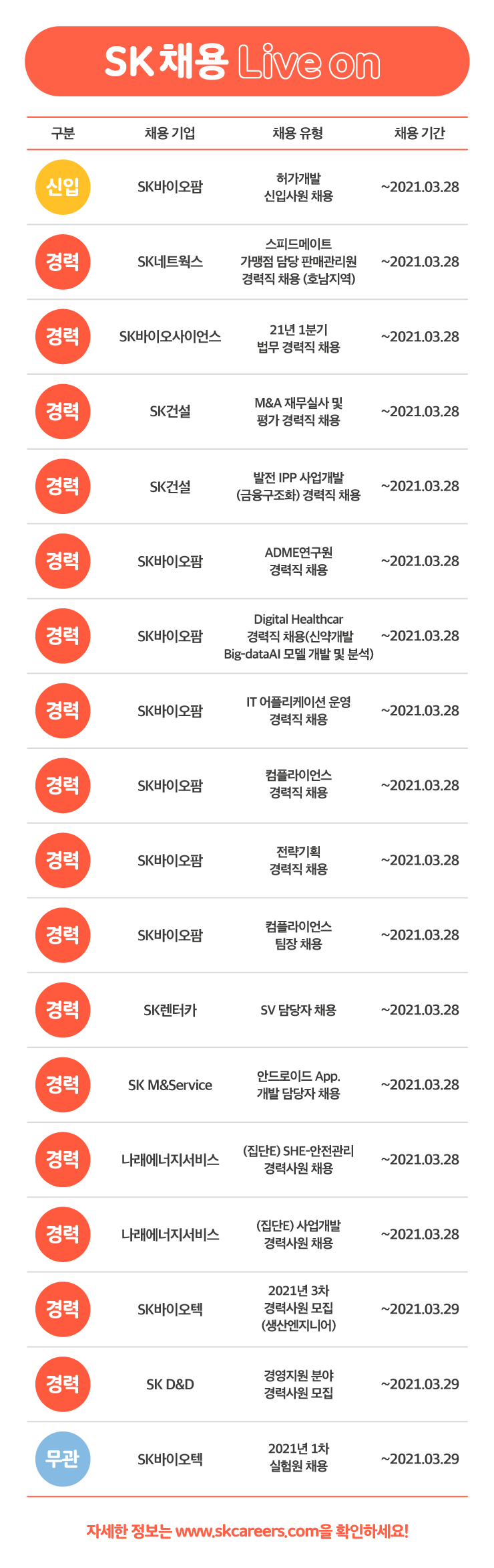 | SK Careers 카카오톡 채널 | 물어보지 않아도 알아서 톡톡 챙겨주는 SK 채용 정보 채널이 있다!? (1) | 2021.03.26 |