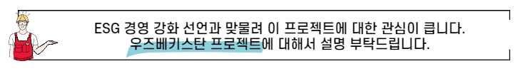 전 세계적 화제로 떠오른 ESG! ESG란 환경(Environment), 사회(Social), 지배 구조 (Governance)의 약자인데요. 이 세 가지가 기업의 지속 가능성과 사회적 영향을 측정하는 핵심 요소라는 것이죠. SK건설도 올해 신년사를 통해 ESG 경영을 강조했습니다. 그리고 그 일환으로 우즈베키스탄 프로젝트를 맡아 추진 중에 있습니다. 2021년 최대의 화두인 ESG 경영! 오늘은 SK건설의 ESG 경영과 우즈베키스탄 프로젝트에 대해 좀 더 자세하게 알아보는 시간을 준비했습니다. SK건설의 그린리노베이션 사업그룹 김지은PL님을 만나 보시죠.