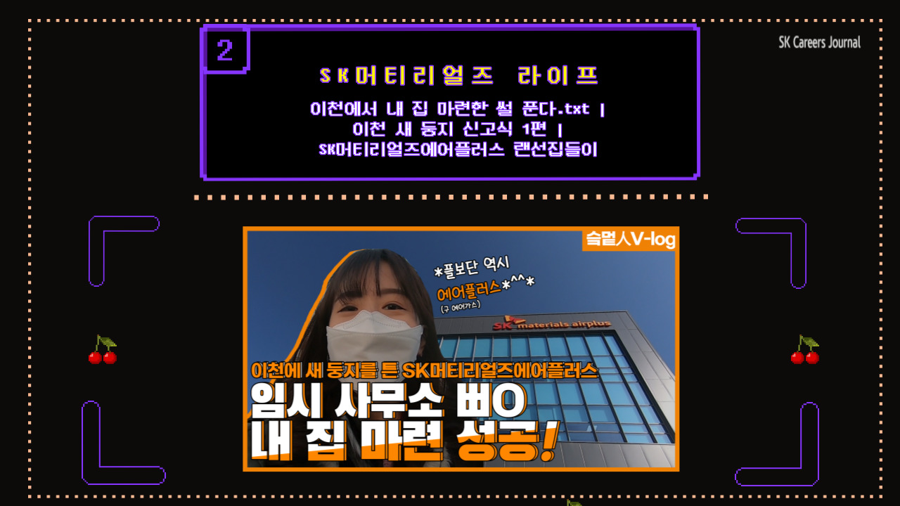 두 번째 소개드릴 영상은 SK머티리얼즈 유튜브 채널 오픈 첫 공개 콘텐츠인 ‘이천에서 내 집 마련한 썰 푼다.txt | 이천 새 둥지 신고식 1편 | SK머티리얼즈에어플러스 랜선집들이’인데요!
