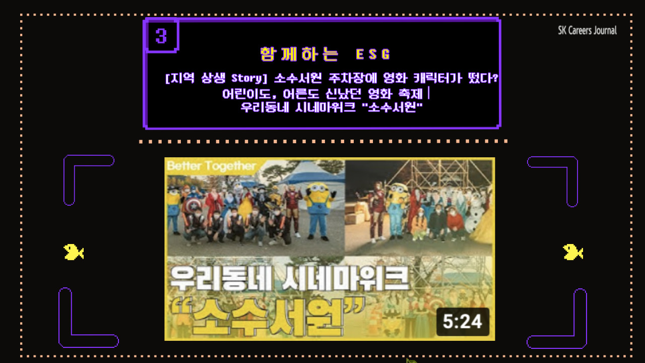 영상은 영주의 관광명소인 소수서원 주차장에서 진행되었는데요, 10 월 할로윈 시즌에 어울리는 코스튬도 볼 수 있었습니다. 자발적인 구성원들의 참여가 있었기 때문에 가능한 일이었다고 하네요! 지역과 가족을 사랑하는 SK머티리얼즈 구성원의 마음을 알 수 있는 영상이었습니다.