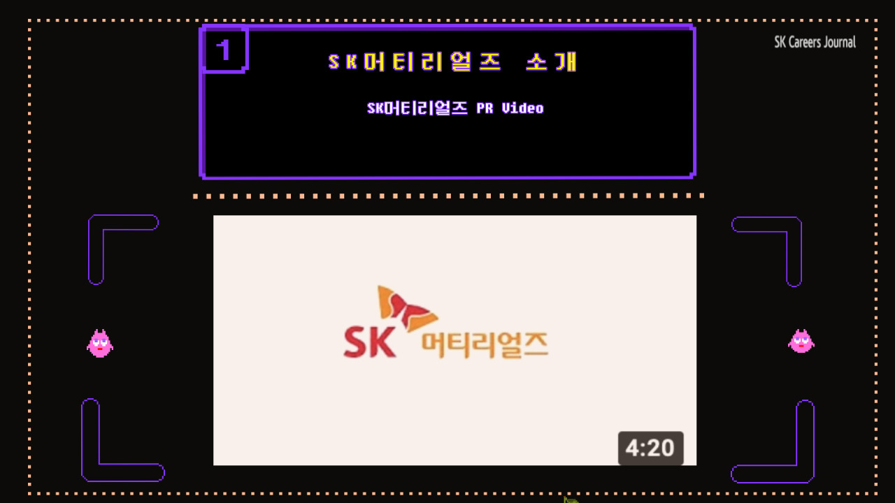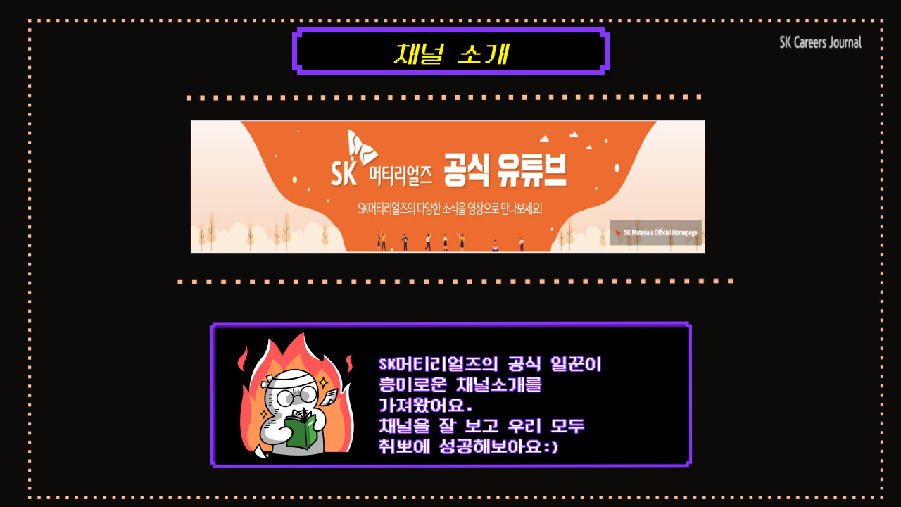 SK머티리얼즈가 공식 유튜브 채널을 개설했답니다! SK머티리얼즈 패밀리의 뉴스와 채용소식 등을 지금 바로 만날 수 있는 채널을 오늘 저와 함께 쏙쏙 파헤쳐 봅시다!