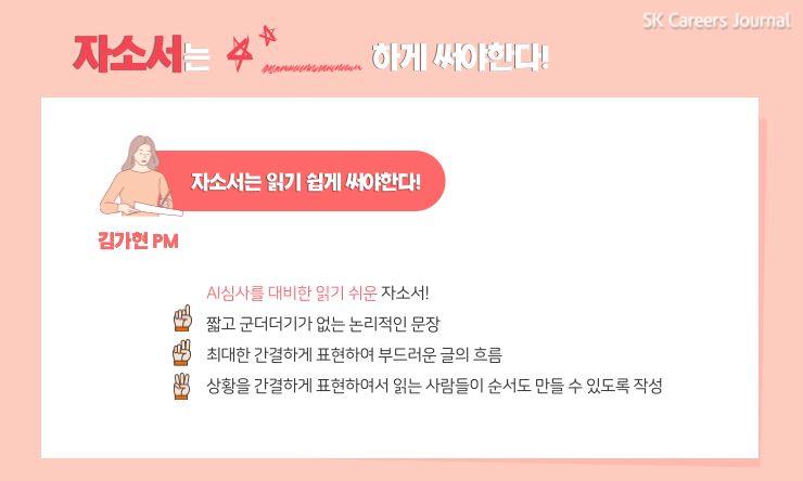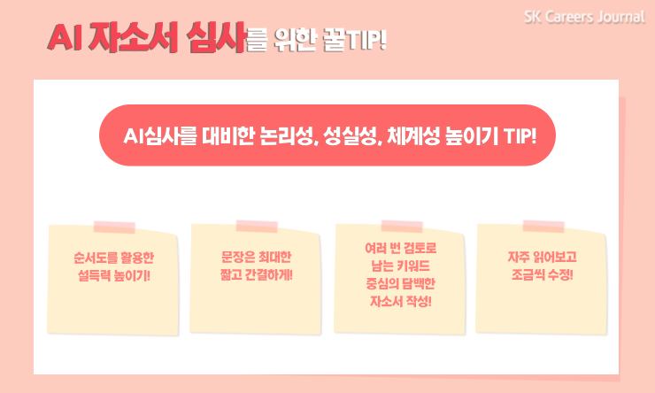 이번에는 특히 AI로 자소서를 1차 심사하기 때문에 그중에서도 읽기 쉬워야 한다고 생각해요. 문장이 짧고 내용에는 군더더기가 없어야 하죠. 다음 문장을 읽었을 때 논리적으로 흐름이 보이는 자소서를 써야 한다고 생각합니다.
