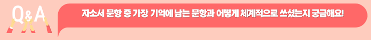 저희의 최종 목표는 단순히 서류 합격이 아니라 최종 합격이기 때문에 면접을 대비해서 자소서를 써야 한다고 생각해요. 패기면접, 공통역량면접, 직무면접까지 모든 면접을 고려하면서 자소서를 작성하는거죠. 그렇기 때문에 자소서를 쓸 때도 계속 이런 문항에서는 어떤 질문이 나올까 정리를 해보고 내가 이런 문항에서 이런 대답을 한다면 과연 대답할 수 있을까, 내가 지금 대답할 수 있는 수준에서 자소서를 솔직하게 쓰고 있는 건가 이런 부분들을 생각하면서 자소서를 써야 나중을 위해서도 좋다고 생각해요.