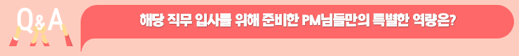 가현 PM : 저도 현수 PM님과 비슷한데요, 제가 생각하기엔 인턴십 근무를 하면서 현장의 일이 어떻게 진행되고 있는지 직접 경험해 보는게 가장 좋은 것 같아요.