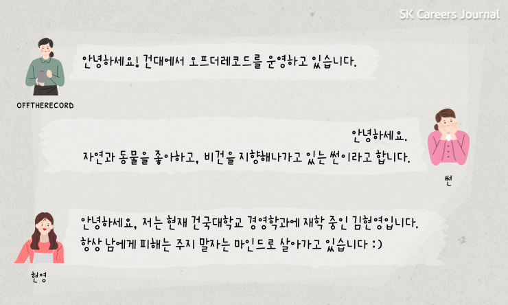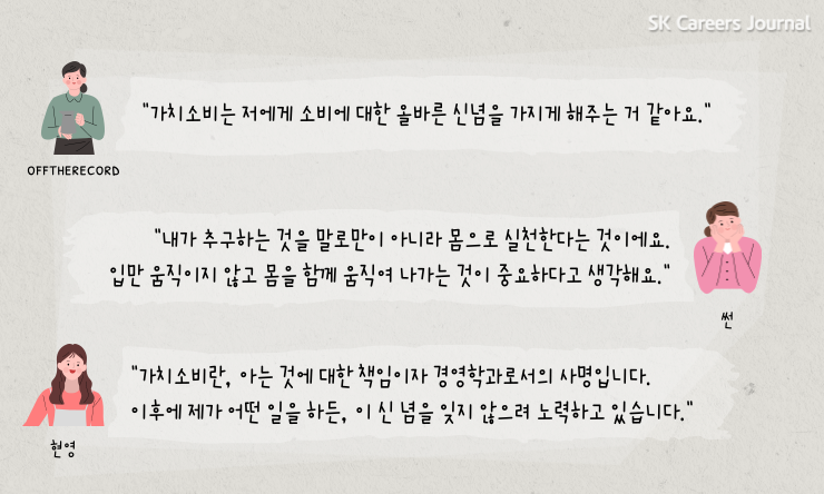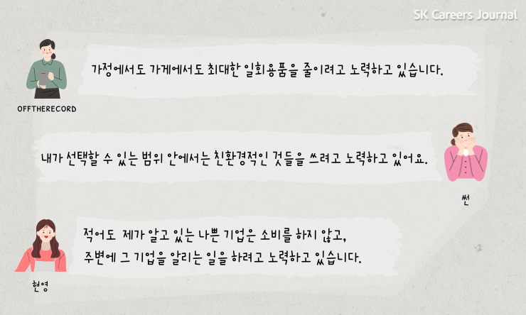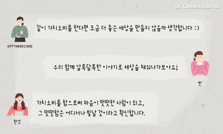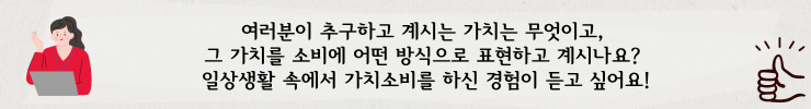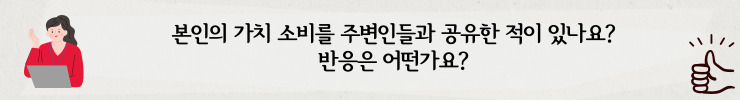 주변에서도 가치 소비를 실생활에서 실천하고 계시는 분들을 쉽게 찾아볼 수 있는데요. 가치 소비를 직접 실천하고 계신 offtherecord님, 썬 님, 현영 님과의 대화를 통해 가치소비에 대해 자세히 알아보겠습니다.