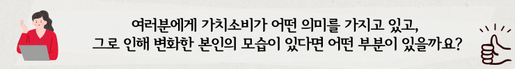 현영 : 저에게 가치소비란, 아는 것에 대한 책임이자 경영학과로서의 사명입니다. 사회적 기업이라는 것 자체를 모르는 사람은 물론, 기업 배경에 대하여 잘 알지 못하여 가치소비를 하지 못하는 사람들이 있습니다. 그렇기에 더더욱 알고 있는 제가 책임감을 가지고 가치소비를 해야 한다고 생각하며, 이 생각은 제가 경영학과를 졸업하고 나서도 하나의 사명으로 가지고 가야 한다고 생각합니다. 이후에 제가 어떤 일을 하든, 이 신념을 잊지 않으려 노력하고 있습니다. 변화한 모습이라면 주변에 이러한 사실을 알리고자 노력합니다.