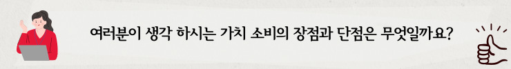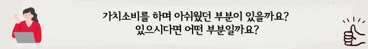 현영 : 가치소비의 장점은 이루 말할 수 없이 많습니다. 하지만 그 장점이 보통 사회에 환원되는 경우가 많고 소비 주체에게 돌아오는 경우가 많지 않기에 지칠 수 있는 분야이기도 합니다. 과거에 저에게 필요한 물품을 구매하려고 한 적이 있습니다. 성능과 가격 등을 고려하여 시간을 내어 조사한 결과 가격대비 우수한 성능의 제품을 찾을 수 있었습니다. 하지만 그 제품은 '사회적 책임'과는 아주 먼, 오히려 사회적 물의를 일으키는 기업의 제품이었습니다. 결국 가격대비 우수한 성능에도 불구하고 구매를 포기하였습니다. 포기하기 직전까지도 ‘그냥 구매해도 아무도 모를 텐데’ 라는 생각이 들었습니다. 종종 이러한 일이 발생할 수 있다는 점이 단점으로 작용하는 것 같습니다.
