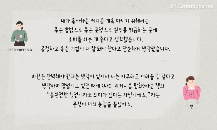 offtherecord : 가치소비는 저에게 소비에 대한 올바른 신념을 가지게 해주는 거 같아요. 내가 번 소중한 돈으로 소비를 할 때 우리가 살아가는 세상에 좋은 방향으로 갈 수 있게 일조를 한다고 생각하니, 소비를 하면서도 이 기업이 어떤 곳이며 어떤 좋은 일을 하는지 살펴보게 되고, 좋은 일을 많이 하는 업체 쪽으로 소비를 하게 되는 거 같아요.