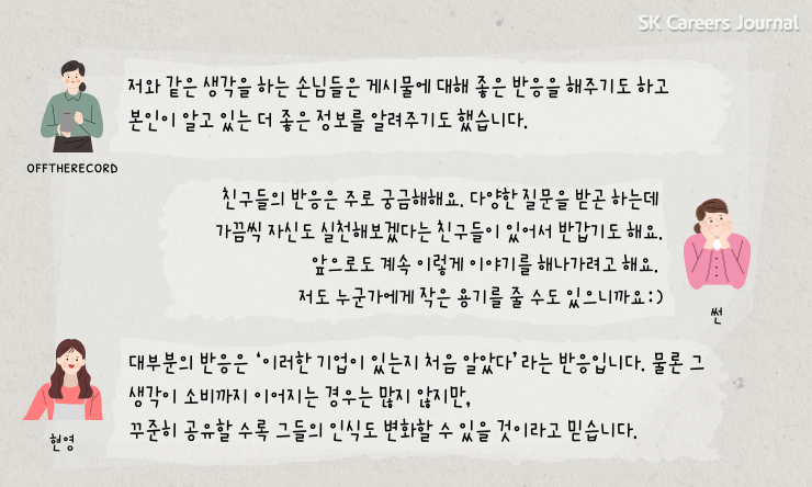 현영 : 대부분의 반응은 ‘이러한 기업이 있는지 처음 알았다’라는 반응입니다. 물론 그 생각이 소비까지 이어지는 경우는 많지 않지만, 꾸준히 공유할 수록 그들의 인식도 변화할 수 있을 것이라고 믿습니다.