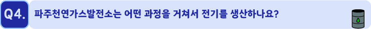 이 과정에서 배출된 배기가스를 열원으로 생산된 스팀을 배열회수보일러에서 증기터빈으로 보내서 고압, 중압, 저압터빈을 돌려 2차 전기를 생산합니다.