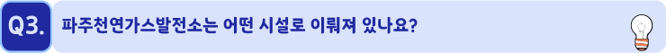 파주발전소는 1,800MW (900MW x 2 Unit)으로 구성되어 있으며, 주요 설비는 각 Unit별로 두 개의 가스터빈, 배열회수보일러와 한 개의 스팀터빈으로 구성되어 있습니다. 또한 부속설비로는 복수기, 냉각탑, 수처리 시설, GIS(송전설비) 등이 있습니다.