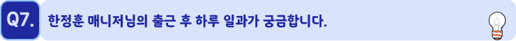 일단 아침에 출근하면 대부분의 직장인처럼 이메일을 확인합니다. 그리고 팀 주간 업무 일정을 확인하고 특히 주요 Issue들에 대한 Due date를 체크합니다. 하루 업무리스트를 작성하고 중요도를 입체적으로 구분하여 우선순위별로 업무를 진행하되, 중간에 타 부서의 급한 업무요청은 우선 처리합니다. 틈틈이 같은 팀 팀원들이나 타 팀원분들과 소통하면서 일상을 공유하기도 하고 업무 관련 Insight를 얻기도 합니다.