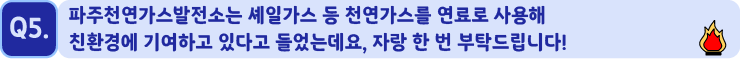 파주천연가스발전소는 첫째, 안전한 발전소입니다. LNG 연료 사용으로 방사능 위험 요인이 없고, 진도 6.5 규모의 내진 설계로 안전을 확보하고 있습니다. 둘째, 깨끗한 발전소 입니다. LNG 발전은 화석연료 중 가장 깨끗한 청정연료로 석탄 등 다른 연료에 비해 미세먼지 및 질소산화물 등 오염물질을 최소화하여 국제적으로 추진되고 있는 탄소중립 목표에 앞장서고 있습니다.