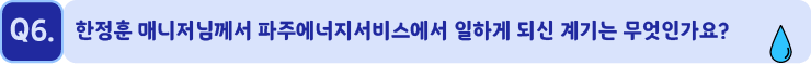 내가 직접 새로운 조직에서 HR제도를 Setting하고 조직문화를 만들어갈 수 있다는 점이 매력적이었기에 파주에너지서비스에 지원하여 근무하게 되었습니다. 특히 회사 초창기부터 규모가 커지는 과정을 보면서 많은 보람을 느끼고 있습니다.