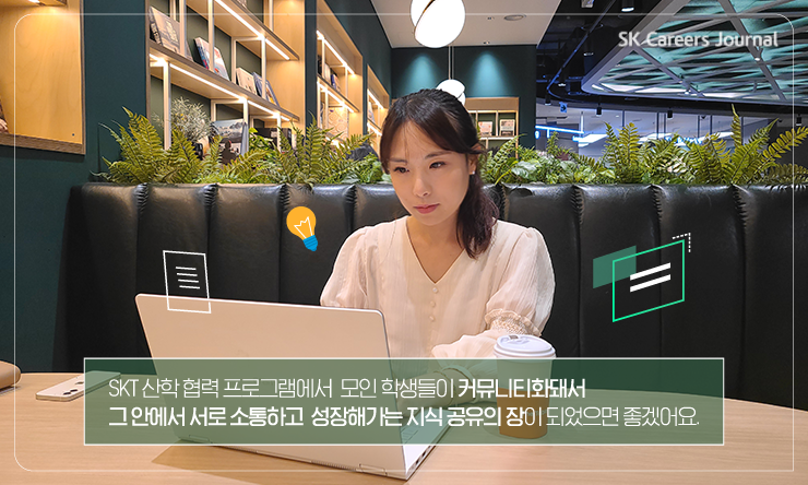 SKT 산학 협력 프로그램을 통해 모인 모든 참가자들이 함께 소통하고 성장해가는 ‘지식 공유의 장’으로 만들고 싶어요. 학생들이 단순히 강의를 수강하고 끝내는 것이 아니라 서로 어떤 학습과 경험을 하고 있는지 공유하고, 현직자들과 꾸준히 소통하며 시너지를 내는 구심점이 되었으면 해요.