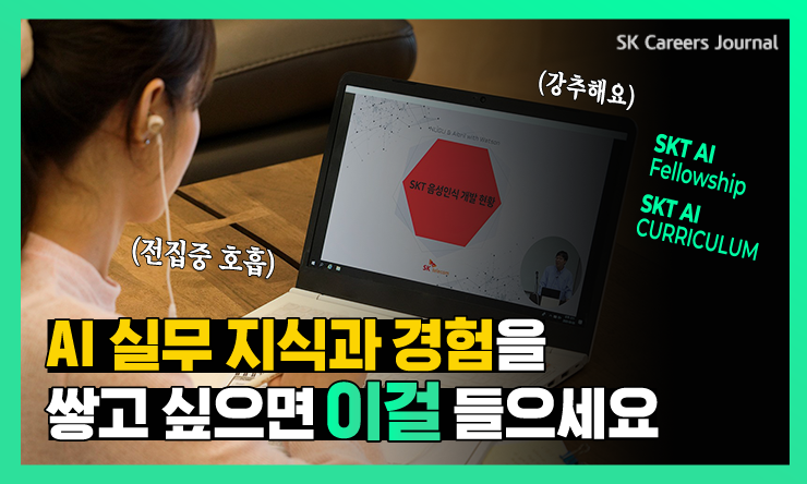SKT AI 커리큘럼, SKT AI Fellowship 두 프로그램 모두 안 할 이유가 없죠? AI 실무형 교육에 관심있는 대학(원)생들이라면 SKT의 산학 협력 프로그램을 놓치지 말았으면 하는 바람입니다. 그렇다면 2021년, SKT AI 커리큘럼과 SKT AI Fellowship은 어떤 계획과 변화를 앞두고 있을까요? 지금 바로 SKT 산학 협력 프로그램을 담당하는 이민정 매니저님의 이야기를 들어 보시죠.