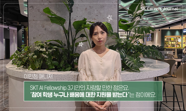 활동이 종료된 후 참가 학생들에게 연락이 많이 오는데, ‘올해 SKT AI Fellowship 3기가 꼭 진행돼서 본인이 받았던 소중한 경험을 다른 학생들이 꼭 얻어갔으면 좋겠다’ 라는 메일을 받았어요. 학생들이 SKT에서 지원하는 프로그램을 통해 새로운 경험을 하고, 성장해 나가는 과정을 지켜볼 수 있어 보람을 많이 느끼고 있어요.