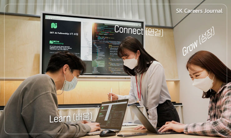 SKT 산학 협력 프로그램의 세 가지 키워드인 Learn(배움), Connect(연결), Grow(성장)로 설명하고 싶어요.