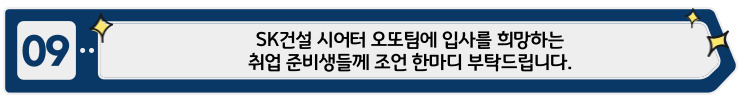 SK건설은 딱딱한 기업 문화보다는 자유로운 분위기에서 소통하고 협의하는 문화를 지닌 회사입니다. 건설 회사라고 하면 꽉 막힌 조직 문화를 떠올릴 수도 있겠지만 시어터 오또 조직이 구성된 취지처럼, 자유로운 의사소통을 추구하고, 새로운 아이디어 창출과 협의를 통해서 업무를 수행하는 문화를 추구하고 있습니다. 회사의 문화에 대해서 어렵다거나 딱딱하다는 걱정보단 본인의 역량을 충분히 발휘할 수 있다는 자신감을 가지고 지원해 주시면 미래에는 동료가 되어 한 공간에서 머리를 맞대고 계시지 않을까 싶습니다.
