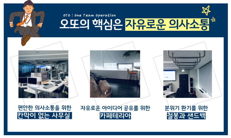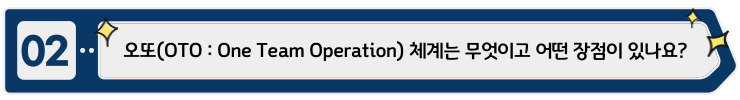 말 그대로 ‘오또’라는 것은 OTO One Team Operation 의 약자로 다방면의 전문가들이 한 팀을 이루어서 동일한 목표를 위해 업무를 수행하는 체계입니다. 다각화된 시각으로 주어진 문제를 입체적으로 해결하도록 이루어진 팀이기 때문에 다양한 솔루션을 찾을 수 있다는 것이 최대의 장점입니다.