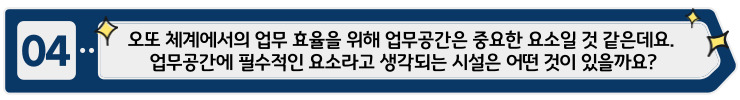 SK건설에서는 다양한 사람들이 협력하기 때문에 다양한 의견이나 생각을 듣는 것이 중요한데요, 그러기 위해서는 편안한 의사소통이 필요합니다. 이를 위해 시어터 오또의 사무실에는 칸막이가 없다는 특징이 있습니다.