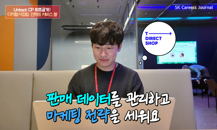 T월드에서는 휴대폰을 매장에서 오프라인으로 판매하지만 Untact CP 같은 경우에는 온라인에서 판매를 해요. SK텔레콤 온라인 채널을 직영으로 운영하고, 고객들에게 휴대폰 이외 다양한 상품과 서비스들을 판매하고 최대한 널리 홍보하고 있습니다.