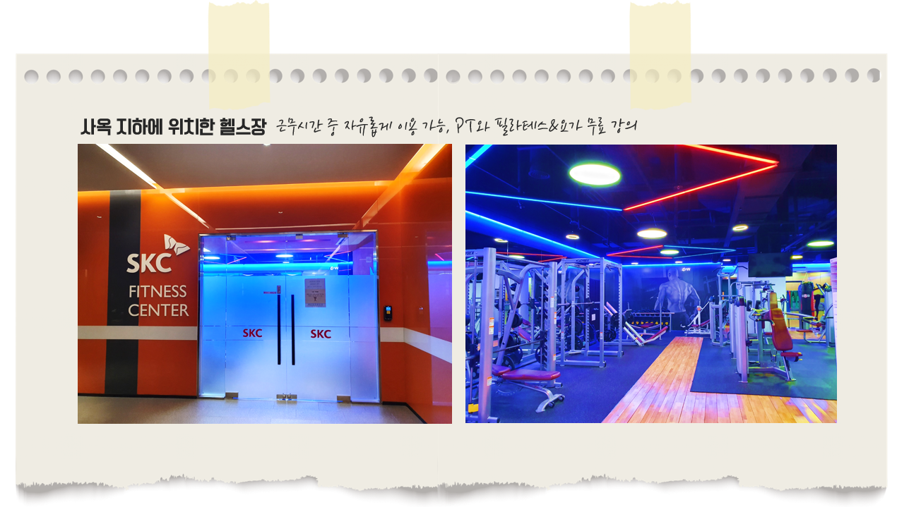 그리고 SKC는 사옥 지하에 헬스장도 잘 갖춰져 있습니다. PT나 필라테스, 요가 무료 개인 강의도 제공하고 있고, 근무시간 중 자유롭게 이용이 가능하여 덕분에 체력관리와 피로관리를 틈틈이 하며 일능률을 높일 수 있습니다 :)