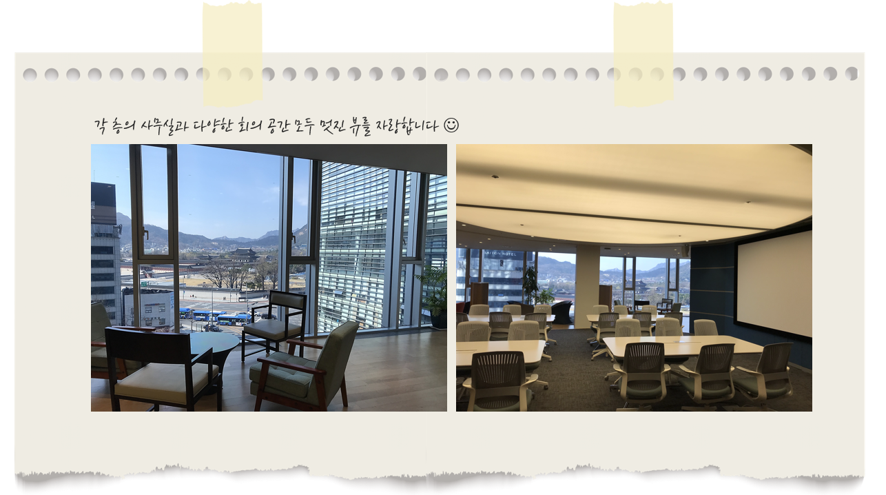 SKC에는 일효율과 행복도를 높이는 좋은 환경이 다양하게 갖추어져 있습니다. 먼저, 사옥의 경치가 참 좋습니다. 모든 층이 통 유리로 되어있어 경복궁, 청와대가 보이는데, 이렇게 탁 트인 사무실에서 일한다는 것 자체로도 큰 장점이라고 생각합니다. 또 사옥 위치가 좋아서 봄에는 바로 앞의 삼청동, 인사동 같은 곳에 잠깐 산책하며 힐링하기 좋다는 소소한 행복도 있습니다.