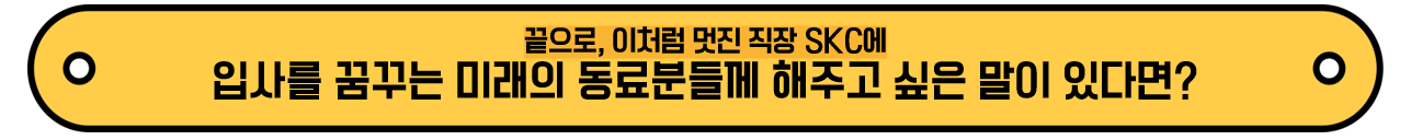 앞서 언급되었듯 SKC는 긍정적이고 역동적인 변화가 많은 회사인 만큼, ‘변화하는 것’에 대해서 두려워하지 않는 분들이라면 우리 회사에 들어와 함께 하면 좋을 것 같습니다. 한 곳에 가만히 머무르고 싶으신 분들이 오시면 본인에게 잘 안 맞거나 적응이 힘들 수도 있지 않을까 싶습니다.