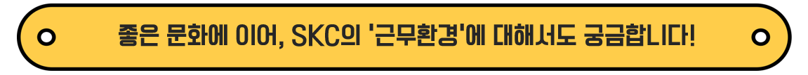구성원에 대한 존중과 배려, 혁신과 변화의 가치가 무척 잘 느껴졌던 SKC의 해피 근무라이프 이야기! 어떠셨나요? 😊 SKC는 일반 소비자가 아닌 회사를 대상으로 중간재 소재를 생산하고 판매하는 B2B기업이다보니 대중적으로 회사와 회사생활에 대한 내용이 많이 알려지지 않은 편인데요, 이번 현직자 인터뷰를 통해 그간 접하기 힘들었던 SKC의 생생한 근무 이야기와 사옥 내부에 대해 많이 알아갈 수 있었던 시간이었으면 좋겠습니다.