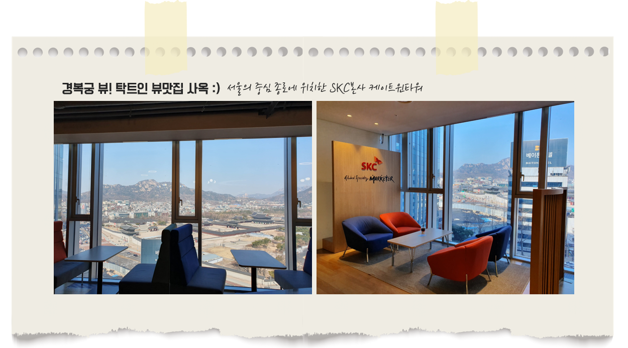 SKC에는 일효율과 행복도를 높이는 좋은 환경이 다양하게 갖추어져 있습니다. 먼저, 사옥의 경치가 참 좋습니다. 모든 층이 통 유리로 되어있어 경복궁, 청와대가 보이는데, 이렇게 탁 트인 사무실에서 일한다는 것 자체로도 큰 장점이라고 생각합니다. 또 사옥 위치가 좋아서 봄에는 바로 앞의 삼청동, 인사동 같은 곳에 잠깐 산책하며 힐링하기 좋다는 소소한 행복도 있습니다.