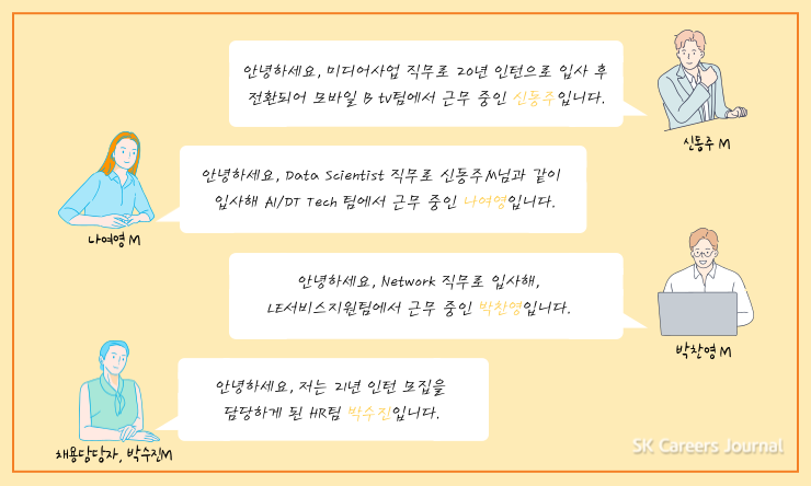 SK브로드밴드의 신입 채용이 시작되었습니다! 그래서 SK브로드밴드 선배님으로부터 “자기소개서 작성 꿀팁”과 “인턴에서 신입사원으로 전환되었던 꿀팁”을 얻어왔습니다! 👏👏 SK브로드밴드 취업 준비를 먼저 했던 선배님들의 핵심 조언을 듣고, 21년 상반기 신입 채용 잘 준비해봅시다! 오늘 인터뷰에는 모바일 B tv팀, AI/DT Tech팀, LE서비스지원팀에서 근무중이신 매니저님들과 HR팀 채용 담당 매니저님이 함께 해주셨습니다. 이번 콘텐츠에는 해당 팀 관련 팁뿐 아니라 전반적인 채용 팁들이 포함되어 있으니, 끝까지 읽어봐주세요!