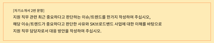 우선 평소 본인이 뉴스 등에서 접한 직무 관련 이슈/트렌드를 한 가지 기재하신 후, 내가 한 경험에서 얻은 역량을 토대로 SK브로드밴드에 입사하게 된다면 구체적이고 실현가능한 계획을 통해 해당 이슈/트렌드를 대응하겠다는 식으로 작성하여 주시면 좋을 것 같습니다. 추가적으로, 이슈를 균형 있는 관점에서 다각도로 파악하려는 노력을 한다면 더더욱 좋겠지요?